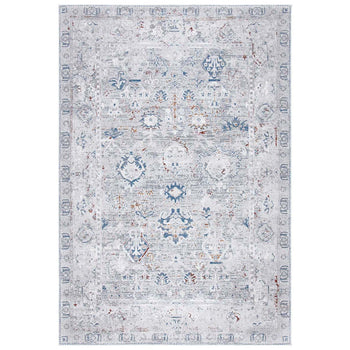 The rug's color palette of elegant grey and tranquil blue creates a serene backdrop, while the intricate transitional pattern lends a classic charm with a modern twist. The pattern depicted in the image showcases a harmonious blend of traditional motifs and contemporary design, making this rug a versatile choice for a range of decor styles.