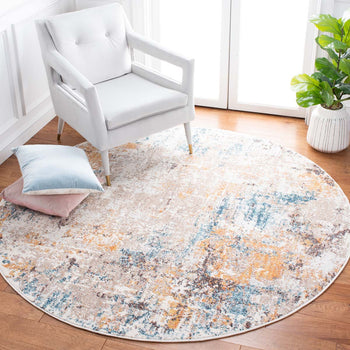 The ivory and yellow color palette is accented with refreshing splashes of blue, weaving a tapestry of warmth and vitality to complement your decor. Its striking design, influenced by the patterns shown in the image, features an artful fusion of abstract and distressed elements, making it a versatile choice for both modern and traditional interiors.