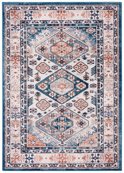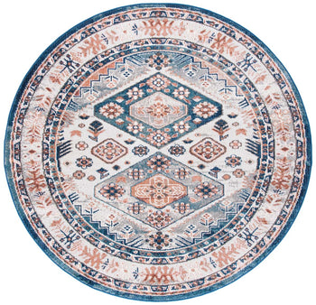 The intricate pattern revealed in the image showcases a harmonious blend of traditional motifs with a modern color palette of ivory and blue, accented by rustic orange and beige hues, bringing a sophisticated and refreshing aesthetic to any space.