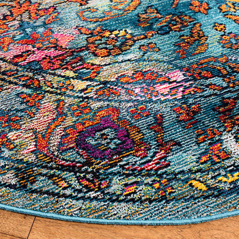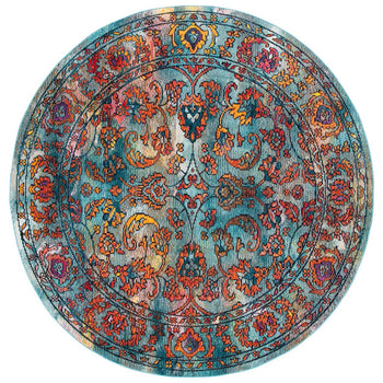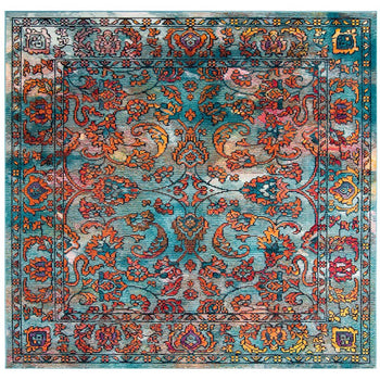 Its striking color palette features a light blue background, subtly complemented by vibrant orange accents that bring a warm and inviting atmosphere to the room. Drawing inspiration from the historical craft, the rug's pattern, as seen in the image, showcases intricate florals and geometric motifs?a harmonious blend that captures the essence of transitional style.