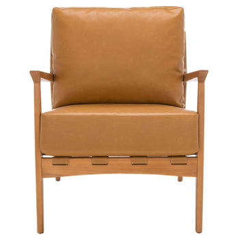 Give a chic and modern update to your living space with our Danisia accent chair. The chair packs a dose of comfort within its refined and clean-lined design. Its gently reclining frame is topped with boxy and generously padded cushions. Straps are securely fitted into the back and seat, offering exceptional comfort and support as you sit and relax. Featuring an ashwood frame and stain-resistant fabric in caramel brown hue, our accent chair brings chic style and easy comfort to your living space, bedroom, or home office.