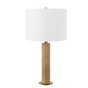 Introducing the Dara Table Lamp, an elegant fixture designed to enrich your home with its serene ambience and thoughtful design. Exuding a soothing beige hue, the Dara Lamp integrates seamlessly into any decor. The natural beauty of the travertine body brings an organic, tactile presence to your space, while the gentle diffusion of light through its fabric shade creates a warm and inviting atmosphere.