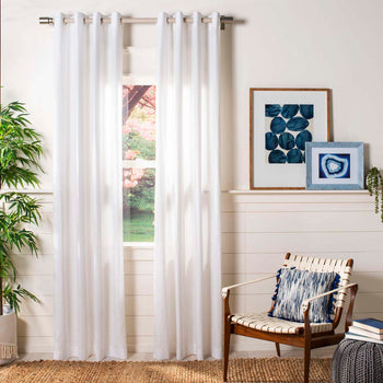 Sheer and awash in unpretentious drama, Darlena Window Panels by Safavieh exemplify the exceptional look found in simple elegance. Colored in opulent pearl and made using a texture rich blend of linen and cotton fabrics, Darlena plays wonderfully with natural light to add a bright, refreshing aspect to room decor. Finished with lustrous metal grommets for a distinctive finishing touch and easy installation.