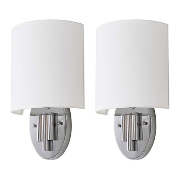 These modern wall scones (set of 2) were inspired by the posh restaurant interiors that beckoned famed socialites in post war London. Their polished chrome finish and geometric form are complemented by the gentle curves of their crisp shades.