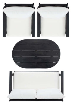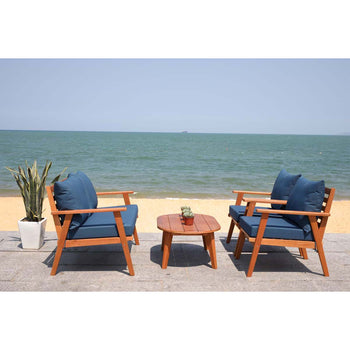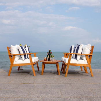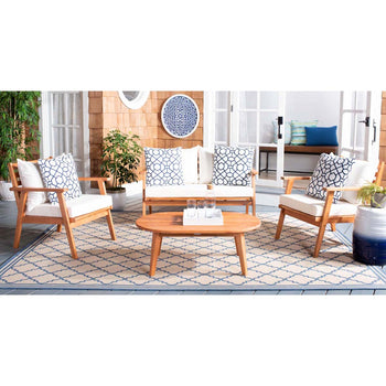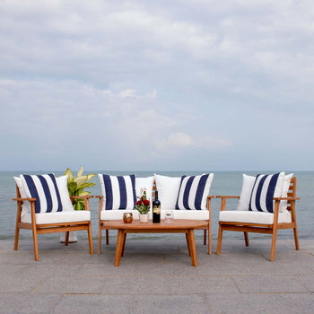 Designed For Value And Versatility, This Contemporary 4-Piece Living Set Creates An Instant Outdoor Room In Any Open-Air Space. Comfy White Pillows With A Navy Mosaic Design And Matching Navy Cushions Sit On Expertly Crafted Acacia Wood Frames, While Its Circular Table Is Ideal For Entertaining.