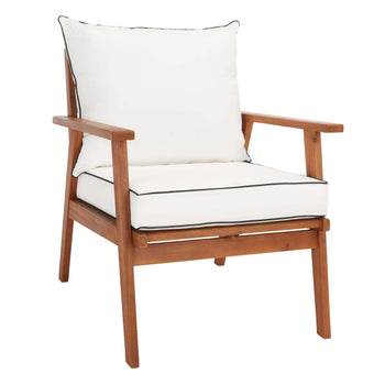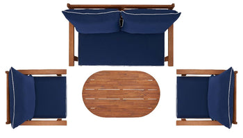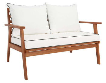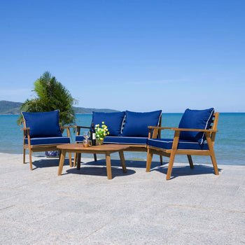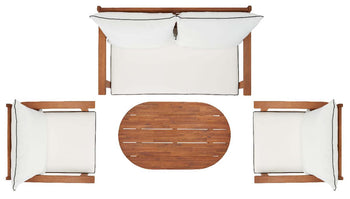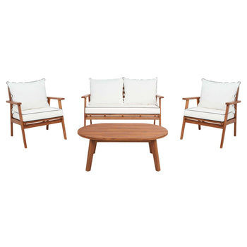 Alive with surf and sand, Sao Paulo's legendary beaches inspired this 4 piece outdoor living set. Crafted of rich natural wood, its clean lines and beige upholstery is ideal for afternoon lounging by the pool.