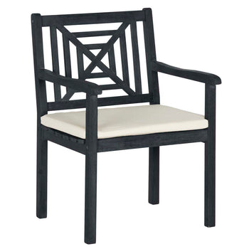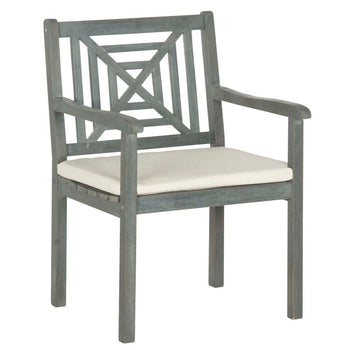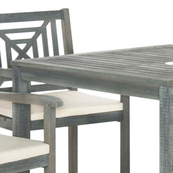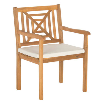A motif of concentric squares adorned with a transitional X detail adorns the chairs of the 5 piece Del Mar outdoor dining set. Masterfully crafted of sustainable acacia wood in natural, this sturdy furniture comes with beige all weather cushions.