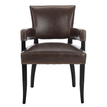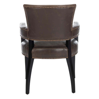 Dashing and sophisticated, the Desa Arm Chair is classically upholstered with antique brown PU leather with brass nail head trim for a rich designer look. Open back and arms lend an airy feel while black birch wood legs work well in both transitional and contemporary furnishings. The ultimate cocktail armchair.
