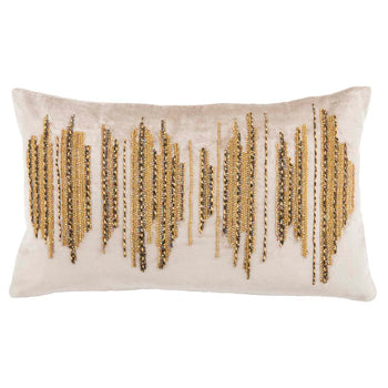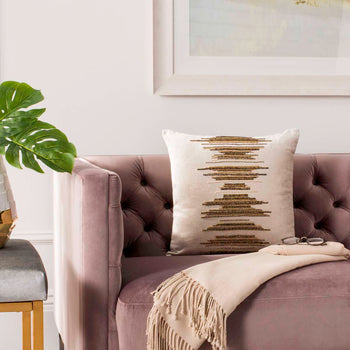 Glamorous and chic, the Deston Darling Pillow is a radiant addition to urbane home Decor. Bands of metallic tinsel are stitched into a free spirited pattern of shimmering viscose and soft cotton, with subtle tonal variation created through beige, gold and copper tones. A marvelous energetic accent for the sofa or chaise lounge.