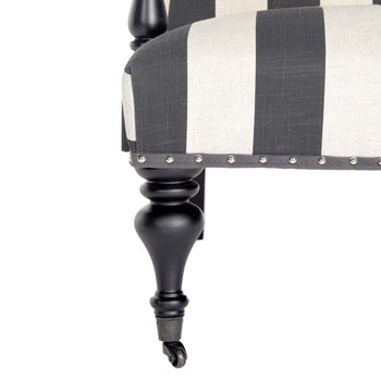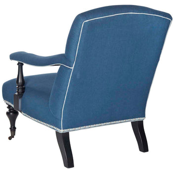 A modern take on a country English piece, the Devona Arm Chair features a classic curved back and open upholstered arms for a light, airy feel. The linen is accented with silver nail heads and black birch legs for a glamorous new look.