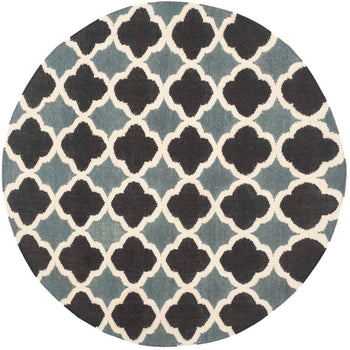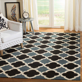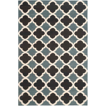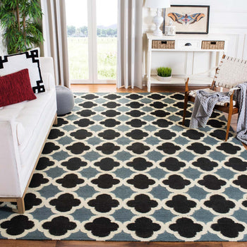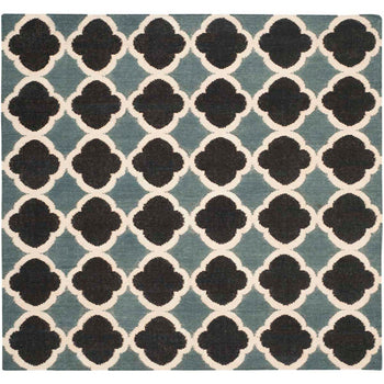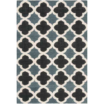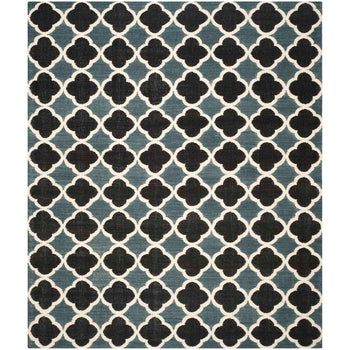 The harmonious combination of blue and navy hues creates a serene yet striking visual appeal. The rug features a bold geometric pattern that seamlessly incorporates intertwining shapes and deep navy accents, exuding both contemporary flair and timeless charm.