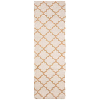 Introducing our exquisite Hand Woven Flat Weave Runner Rug, a timeless addition to any home seeking an infusion of elegance and craftsmanship. Made in India, this 2'-6" X 8' runner rug exudes an enduring charm with its classic ivory and gold color palette, harmoniously blended to create a serene and inviting atmosphere in any hallway or elongated space.