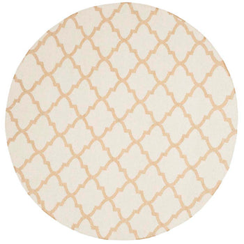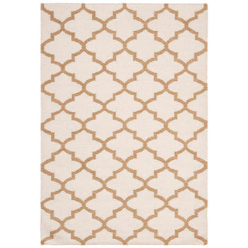 The rug boasts a mesmerizing pattern featuring a lattice of crisp gold geometric lines elegantly interlocking across a creamy ivory backdrop. The simplicity of the design provides a versatile look that complements both contemporary and traditional interiors, enhancing the decor without overpowering it.