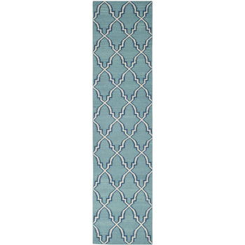 Embrace the unique combination of artisanal craftsmanship and modern design with our Light Blue/Ivory Hand-Woven Flat Weave Runner Rug ? a statement piece that gracefully complements a myriad of interior styles.