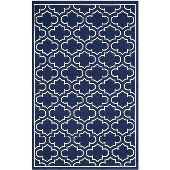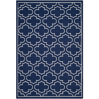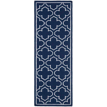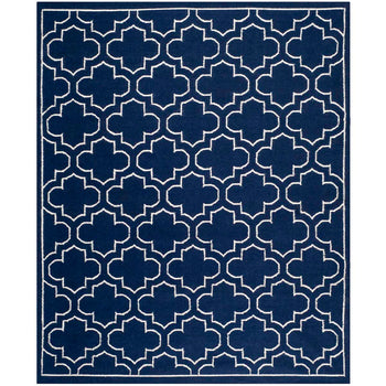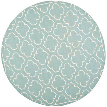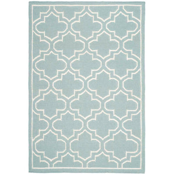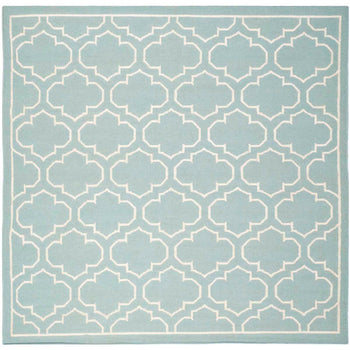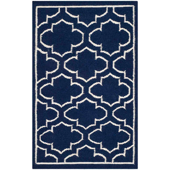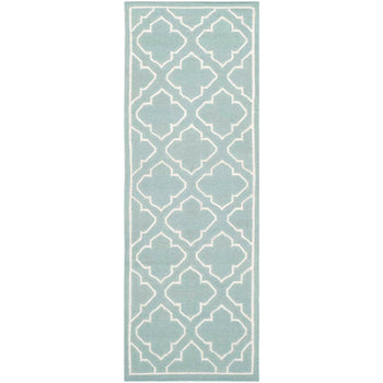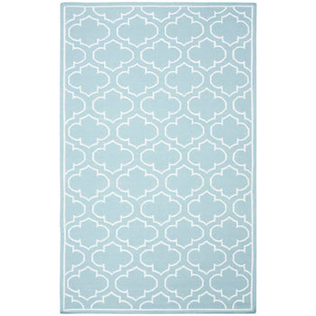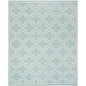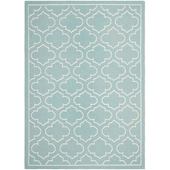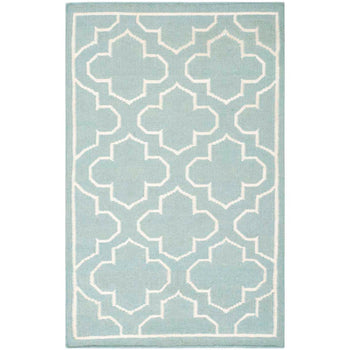The serene palette of blue and ivory brings a breath of calm to any space, while its accent shape adds a unique touch to the room. The rug's design features a harmonious pattern with geometric shapes, exuding a timeless charm that complements both modern and classic interiors.