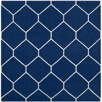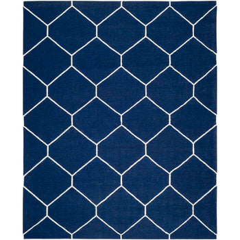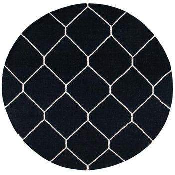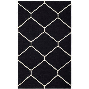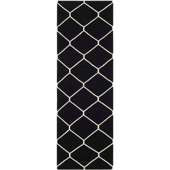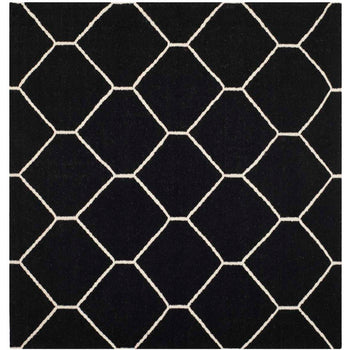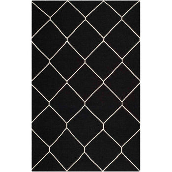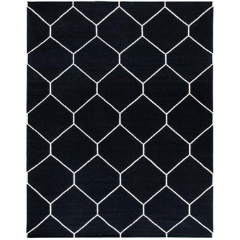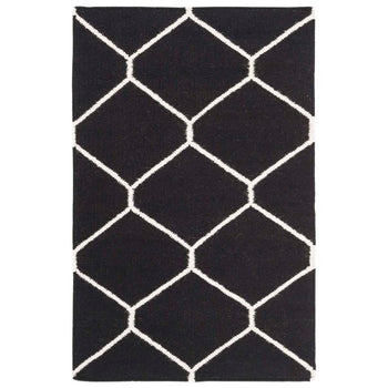 The design features a bold geometric pattern, showcasing crisp ivory lines that create a series of interconnected diamonds across a deep black background. This eye-catching pattern brings a touch of sophistication to any room, making the rug an ideal choice for an entryway, bedside, or as a focal point in smaller living areas.