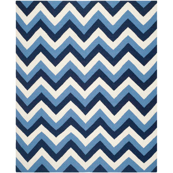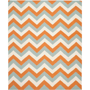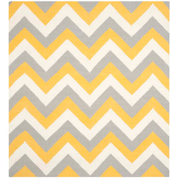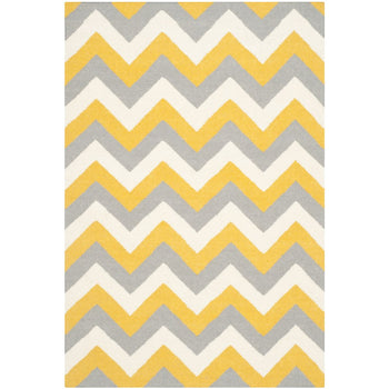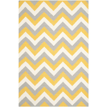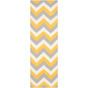 The rug boasts a striking chevron pattern, featuring alternating bands of gold and grey that create a captivating zigzag design. This timeless motif exudes both modernity and tradition, making it a versatile addition to any decor scheme, from contemporary to classic.