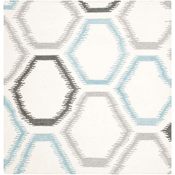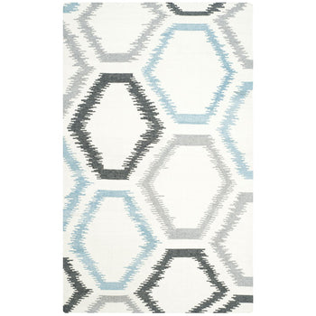 Our rug's inviting ivory base is elegantly accented with a dynamic multi-colored geometric pattern featuring serene shades of blue and refined greys, creating a visual symphony that is both bold and soothing. The sharp, jagged lines meandering across the rug bring an energetic and modern vibe to the piece, ideal for enhancing the decor of any room.