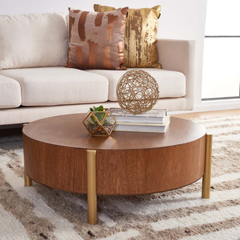 The Epitome Of Contemporary Chic, This Diangela Coffee Table Exudes Stylish Modern Charisma. Diangela's Substantial Round Natural Wood Base Brings A Rich Sense Of Warmth To Any Interior, While Sleek Gold Legs Make It Effortlessly Elegant.