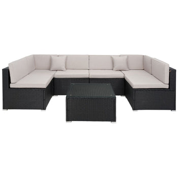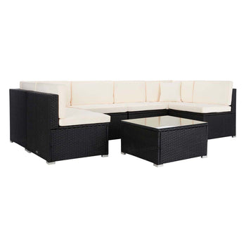 The living room sectional moves outdoors with fabulous modern flair in this Diona Living Set. Strong and chic, Diona's texture rich black frames support luxurious white cushions, making for lavish outdoor lounging. Diona includes a matching glass topped coffee table to complete the look.