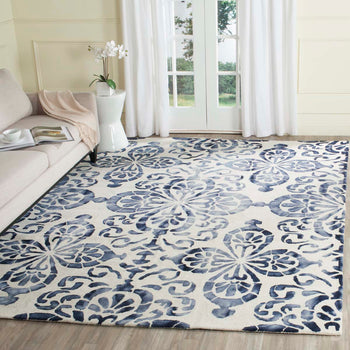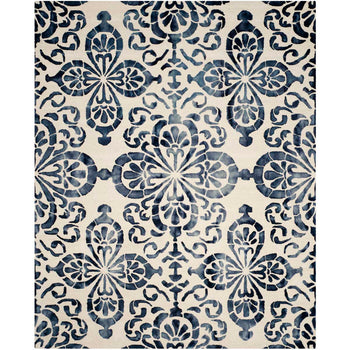 The design features an opulent ivory and navy color palette that brings a sophisticated and classic look to the room. The intricate pattern, inspired by the image provided, showcases a stunning floral motif that symbolizes elegance and grandeur. Each detail of the pattern is carefully delineated to create visual interest and a dynamic aesthetic.