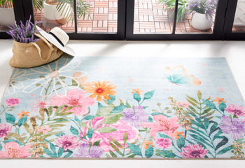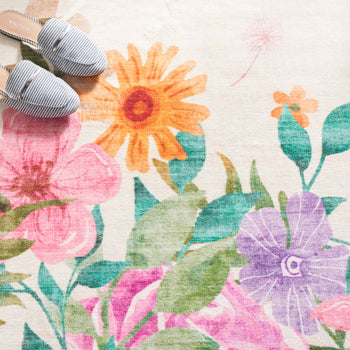 The rug highlights a captivating garden pattern brimming with lush flora and fluttering butterflies, transforming your space into a serene retreat. The intricate design showcases a subtle mix of colours and shapes that invite the tranquility of nature into your home.