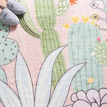 Crafted with cutting-edge Power Loomed technology, this rug boasts a robust construction of high-quality polyester, ensuring durability and softness underfoot. The playful pink and green hues bring life to the charming cactus and floral pattern that adorns the surface, evoking a desert oasis vibe that's both tranquil and invigorating.