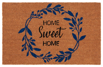 The natural hue of the rug makes it a timeless addition to your decor, seamlessly blending with a variety of styles. At the heart of its design lies a delightful graphic pattern: "Home Sweet Home" is encircled by a wreath of navy blue leaves, imparting a welcoming message to each guest who graces your space.