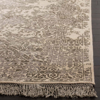 The design features an intricate, classic pattern, displaying a symphony of beige and grey tones that seamlessly blend together, creating a harmonious and inviting atmosphere. The detailed border frames the artistry within, celebrating the traditional heritage in a contemporary fashion.
