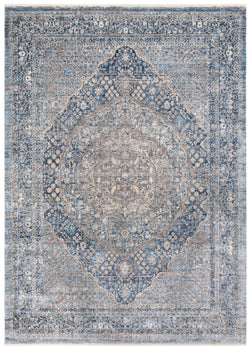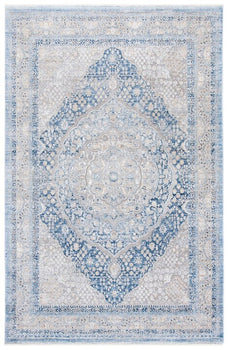 The rug features a striking navy and grey color palette, beautifully balanced to enhance the intricate pattern that adorns its surface. The design showcases a central medallion surrounded by florals and bordered with classic motifs, creating a sense of luxury and sophistication that complements any room.