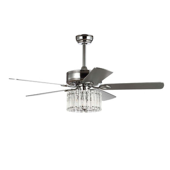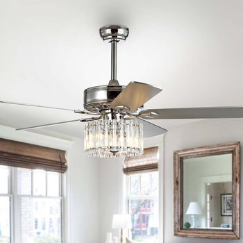 Designed to add glamour and opulence to any room, this contemporary ceiling light fan is an investment. While its powerful chrome fan creates an ideal year round atmosphere, its luxurious shimmering crystal shade diffuses light for instant ambience.