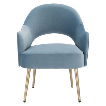 A glamorous modern take on retro charm, this Dublyn Accent Chair abounds with fashion-forward appeal. Dublyn redefines the classic club silhouette with a cut-out back and gently sculpted arms in luxuriously soft cream velvet, while tapered gold metal legs complete the look.