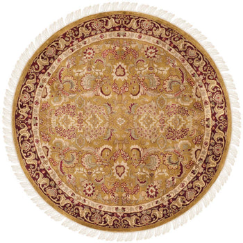 The rich gold base of the rug is artfully complemented with deep red accents, creating a harmonious blend that exudes warmth and elegance. The intricate pattern, inspired by classic motifs, features a sophisticated medley of floral and geometric designs that together evoke a sense of timeless tradition and grandeur.