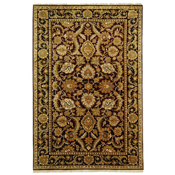 Elevate your living space with the timeless elegance of our Hand Knotted Wool Area Rug. Crafted with precision in India, this 5' x 8' medium rectangle rug is a luxurious testament to traditional rug-making techniques. The rich burgundy and black hues are woven intricately into an exquisite pattern, featuring ornamental motifs that resonate with the grandeur of bygone eras.