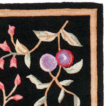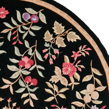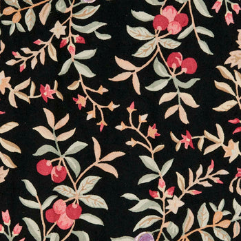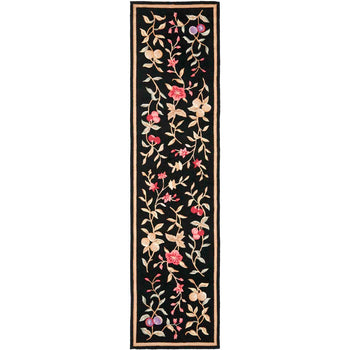 Crafted with meticulous attention to detail, the rug features a luxuriously bold black background, serving as a dramatic canvas for the enchanting floral pattern that adorns its surface. The vibrant blossoms and delicate foliage, depicted in shades of pink, beige, and subtle hints of purple, bring a touch of nature's serenity indoors. The contrasting colors are expertly chosen to pop against the deep black, ensuring that this runner will be a focal point wherever it is placed.