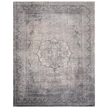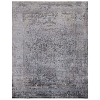 The rug's subtle transition from grey to charcoal is an homage to the timeless elegance of Transitional style. Intricate patterns resonate with sophistication and culture, adding an element of class to any room. The design, drawn from the image provided, features a delicate balance of ornate historical motifs and a contemporary distressed effect that effortlessly bridges classic and modern decor elements.