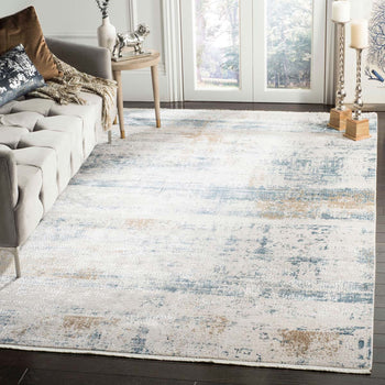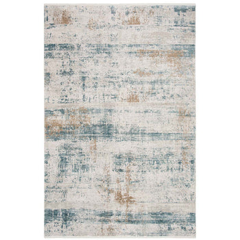 The rug's design features an intricate pattern with delicate streaks and an artful distressed finish that exudes a sense of history and character. Made with a luxurious mix of 66% acrylic and 34% viscose, it promises a soft, silky feel paired with durability and easy maintenance.