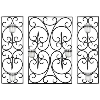 Three rectangular panels, with six glass votive candles holders, make a dramatic statement. This classic scrollwork patterned wall sconce is crafted from iron, with a sophisticated black finish.