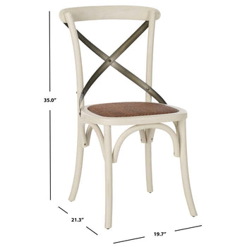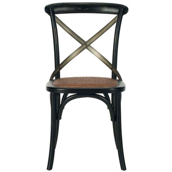 No chair is as famous as Thonet's bentwood cafe model, and Safavieh's Eleanor X Back side chair pays homage to the beloved original. Your kitchen or dining room will conjure images of Vienna cafe society with Eleanor's bent metal frame in an distressed ivory finish, rattan seat and authentic arch brace in black metal.