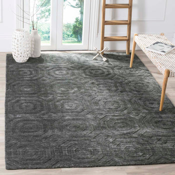 Elevate your living space with a stunning blend of elegance and contemporary design. This dark grey area rug, sized at 6 feet by 9 feet, offers a perfect medium rectangle to complement any room. Crafted using a loom knotted technique, it exudes a sophisticated charm while the combination of 75 percent viscose and 25 percent wool brings a touch of natural comfort to your floors. Sourced from India, this rug embodies the essence of contemporary style with its understated simplicity. The thickness of three-eighths of an inch provides a pleasing balance, while the absence of patterns ensures it seamlessly fits into any decor. Embrace the warmth and texture this rug brings to your home and experience the artistry of handcrafted elegance.