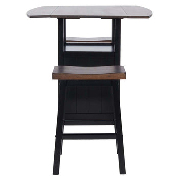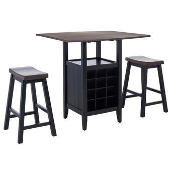 Create a bistro ambiance at home with this versatile Emeric Pub Table. Great for a quick meal in the kitchen or drinks in the billiard room, Emeric is crafted of Malaysian oak finished in espresso and comes with two bar stools and a drop leaf table with built in wine storage.
