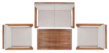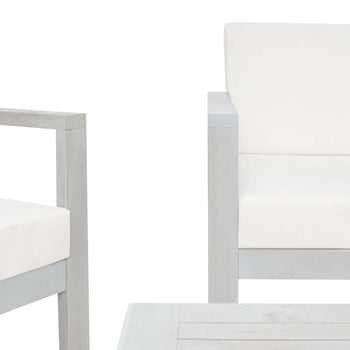 The contemporary class of this Emiko Living Set will effortlessly transform your patio into a luxurious outdoor oasis. Styled with clean-lined Parson's-inspired frames on its two armchairs, one loveseat, and coffee table, Emiko's soft grey finish is undeniably chic, and plush beige cushions ensure lasting open-air relaxation