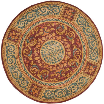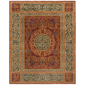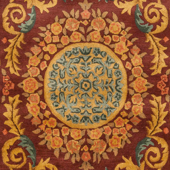 The rich tapestry of burgundy and gold tones intertwined in this rug's intricate pattern brings a sense of warmth and sophistication to any room. The classic design features a central medallion surrounded by floral motifs and bordered with a complementary pattern, echoing the artistry of traditional craftsmanship.