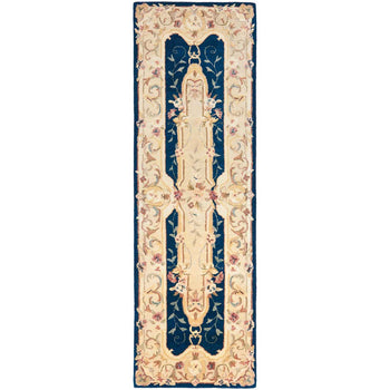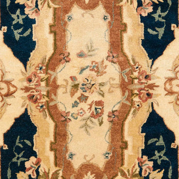 The centerpiece of the rug is its striking navy base that establishes a distinguished backdrop for the intricate beige floral and botanical patterns that adorn it. Accents of muted tones gracefully complement the central design, creating a harmonious visual that captivates and charms.