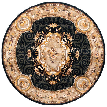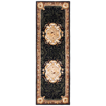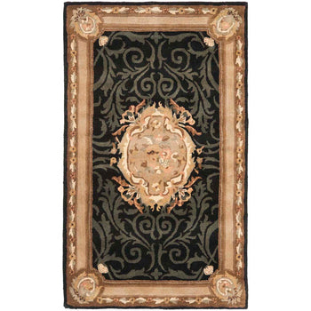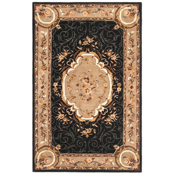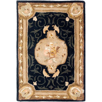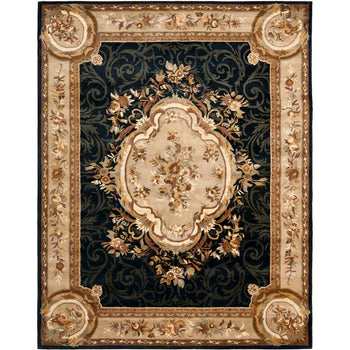Skillfully crafted from the finest wool, this rug boasts a comfortable pile height of 3/8", offering a plush feel underfoot without compromising on durability. The rich, dark hues are elegantly contrasted by lighter accents, creating a stunning visual that accentuates its ornate borders and ornamental central medallion.
