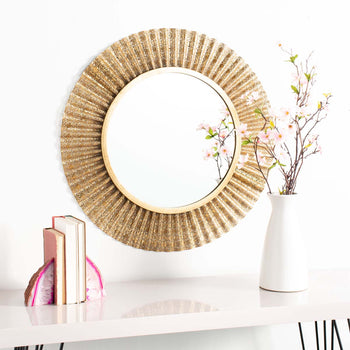 Add a classy retro look and touch of glam to room decor with the Ensley Mirror. Finished in gold with a larger mirrored center, Ensley is a perfect finishing element for the living room, foyer, or family room.