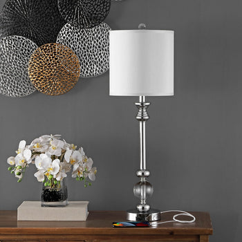 A classic form gets a refreshing makeover in the Erica Crystal Candlestick Lamp. Chic and sophisticated, this versatile lamp combines a crystal ball and chrome body topped with a white shade to maintain a light and airy aspect. Sold in sets of two.