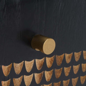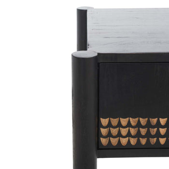 Overflowing with contemporary charisma, this exquisite Errington Nightstand revitalizes any modern bedroom. Unapologetically dramatic, hand-carved natural accents against a jet black finish create a luxe look that emanates couturier chic, while cylindrical legs provide a stylish counterpoint to its starkly angled frame.