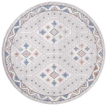 The rug's design seamlessly combines the warmth of a classic motif with modern aesthetics, featuring a harmonious blend of grey and ivory hues complemented by tasteful accents of blue and earth tones. The intricate geometric patterns and symmetrical medallions create a focal point that is both timeless and fashionable.