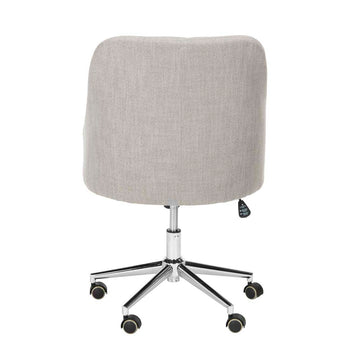 Inspired by the office of a top fashion blogger, this tufted linen chrome leg swivel office chair puts a new spin on classic barrel chair. Its chic tufting and plush grey upholstery are paired with casters and a swivel mechanism for maximum versatility.